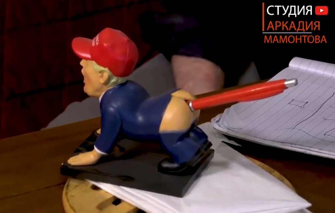 Здесь интересная сцена, камера показывает на полке шкафа сувенирную фигурку Д. Трампа, изготовленную в виде подставки под письменную ручку и в позе «на четвереньках с голым задом, с торчащей письменной ручкой в этом заду». После фигурку сняли и в кадре показали фигурку с другой стороны.